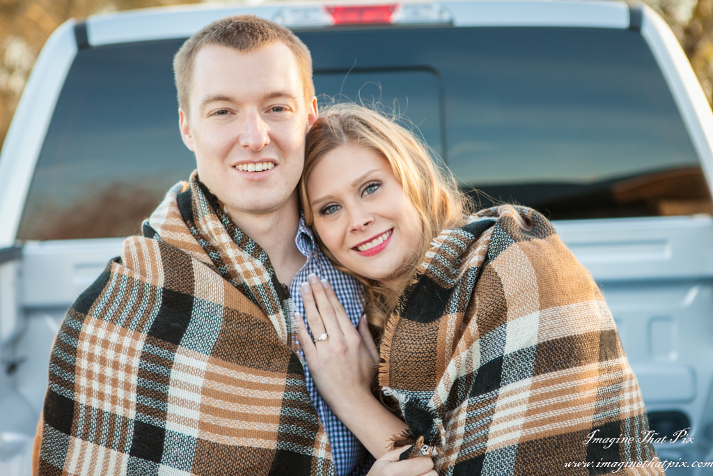 Quite possibly my favorite aspect to this shoot was the specific things that our couple brought. The wood plaque with their date on it is one they made. The darling wrap in the bed of his truck? Theirs too. but my absolute favorite is the album cover, where the simple joys are captured in the fact that their heads together make a heart. I absolutely cannot wait for the wedding, as this is going to be one for the books! Something equally to note: the more fun you are willing to have on your shoot, the more likely we are to get images that show your joy, your love, and your laughter naturally. Alyson and John joked, laughed, and cut up throughout the shoot. We tried things that sounded like they would look good and to our amazement some really did. Others were the fodder for the next really good laugh. Moral to the story? Forget the camera is there, and be silly. Be in love. And most of all, enjoy!