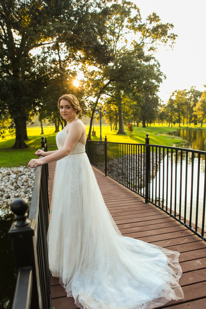 Just North of  Houston is a gorgeous place to check out for those wanting rustic elegance with city access. In the heart of Magnolia, Texas lies Balmorhea, a sprawling acreage with stone-paved buildings. It has an old chateau feel, intimate, with a small bridge crossing the lake, and a fountain that reflects the sun at sunset in a way that feels like Midas himself kissed it goodnight. The quiet out here hugs you, like a warm blanket at the hearth on a cold day. It’s not the maddening quiet of a silent office space, or empty hallways. It’s a contentment. A blissful quiet that allows one to be lost in the moment. It is here, Chelsea and David decided to tie the knot. But before we walked them down the aisle, we journeyed out to Balmorhea to take her bridal portraits.