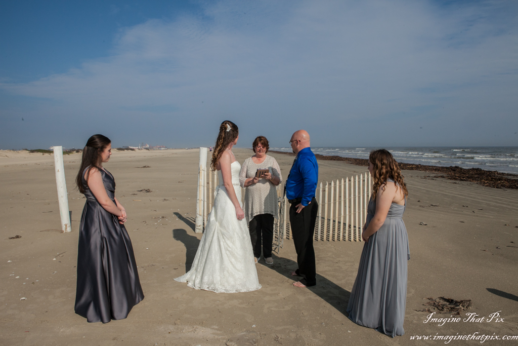 When the average wedding costs tens of thousands of dollars, couples find themselves questioning at times if all the pomp and circumstance is worth it. This is most especially true, if this isn’t a first wedding. I often hear, “We did the big wedding thing already. This time, not so much.” Occasionally, I will have a couple decide to elope. They still want pictures to remember their big day, even if it isn’t so “big”. I find myself absolutely adoring these weddings, because their simplicity places so much focus on what truly matters at a wedding: each other. Enter the beach wedding. Erika and Paul did a marvelous job with their beach wedding. An officiant joined us on the beach in Galveston, Texas, and the couple was joined by their daughters. There, the 6 of us participated in a simple, elegant, and truly touching wedding.