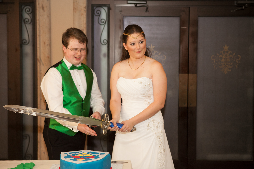 David and Kathy are literally the world’s cutest gamer couple. Meeting them was very much akin to finding a best friend you didn’t know you were missing. And listening to them both talk about their passions for gaming, comics, comicons and cosplays, made me realize that I absolutely HAD to shoot this wedding. Then they let me in on the big surprise: this wedding would be themed using elements from The Legends of Zelda. Yes, Zelda. From Rupee favors, to green uplighting, and even an incredible sword to cut the cake (an Imagine That Pix first, to be certain), they kept this formal, classy wedding fun. Classical music choices were paired seamlessly with current hits and even the Aggie War song. It remains a favorite wedding of mine!