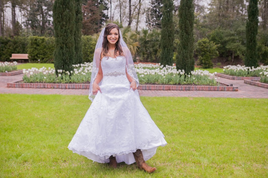 Tammy is one of those timeless brides that comes along, radiating the joy of her engagement and bringing such light to the shoot. The kind that you just know, she is absolutely in love and thrilled. After much discussion, we decided on Mercer Arboretum and planned a date, and a backup date just in case. Thank goodness we did because our first got rained out. The day of the shoot, it rained all the way up to our appointment, stopped just long enough to shoot, and commenced pouring as soon as we finished. We shot in March, and thanks to the mild winter were greeted with a sea of paper white tulips. I brought the parasol along just because you cannot have a country bride with this level of elegance without a parasol. Mine had not come in yet, and this fantastic young lady named Cheyenne in Kerrville, Texas took a huge chance on letting me borrow hers, knowing I was in a bind and desperate to find one soon. We have since gotten ours that was on order. The diverse backdrop available for all of the pictures made the hour and a half session fly by. Tammy brought her boots, which made the pictures in the Texas native garden perfect, and supplied a bouquet just like she would have for the wedding. But the moment that absolutely left me star-struck was rounding the corner to the section of the garden that had a tree covered in tiny purple blooms. The recent rain scattered thousands of tiny purple petals like glitter on the cobblestone path, making for a breathtaking image of the lovely Tammy surrounded by an Enchanted Garden effect.